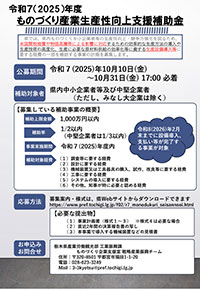 県では、県内のものづくり中小企業者等が行う米国関税措置や物価高騰等による影響に対応するための効率的な生産方法の導入や生産技術の高度化、生産に必要な原材料供給の効率化等に資する生産設備導入等に要する経費の一部を補助する「ものづくり産業生産性向上支援補助金」の事業計画を募集します。