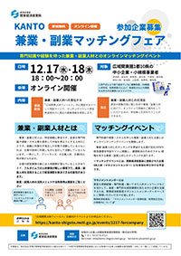 関東経済産業局では、専門知識や経験を持つ兼業・副業人材と中小企業をつなぐオンラインマッチングイベントを開催します。